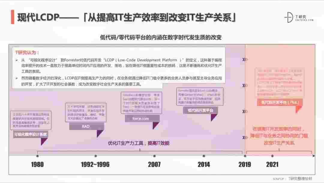 2020年前后,,源于提高IT工作者开发效能的LCDP不断进化和衍生,,,,面对业务导向日益明显的数字化变革。。LCDP衍生出了面向不同对象的升级服务——面向专业人群的LCDP和业务人群的NCDP,,,,LCDP与NCDP的不同服务属性被逐渐认可和接受。。。 LCDP在提高IT开发效率的同时,,,降低IT与业务之间协同的门槛改变IT生产关系。。。